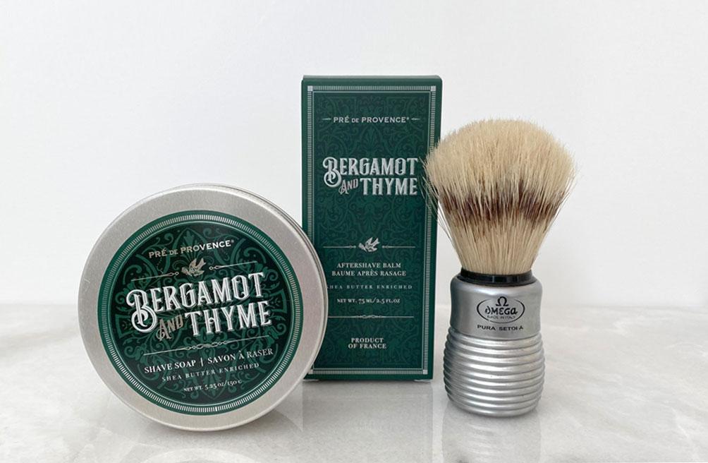 Here we combine our Omega natural boar bristle brush with rich Pre de Provence shave soap and after-shave balm for a luxurious shave from start to finish. The bergamot and thyme scent is so clean and fresh! Makes a wonderful gift.